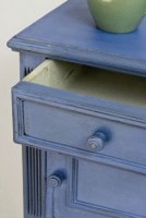 greek blueにペイントし、dark waxを少し使用して、質感を出すため擦ったフレンチベッドサイドテーブル。