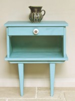 graphiteでペイントされた壁をバックにduck egg blueでペイントされたスモールキャビネット。